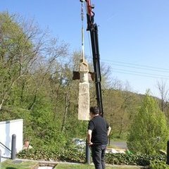 Mit einem großen LKW-Kran wurde der Erdenwächter dann auf die Anhöhe, auf der das sakral anmutende Gebäude erbaut ist, empor gehoben und in Position gebracht. Als Wächter schaut die Skulptur nun vom Haus abgekehrt in die tieferliegende Ebene.