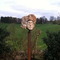 Allegra steht im Bergischen Land am Rande einer Naturlandschaft.Allegra, die Freundliche, ruht auf einem Eisenkorpus, sich drehend um 360 ° und nimmt Kontakt zu ihrer Umgebung auf, dem Garten, den Menschen und der Weite der Natur.