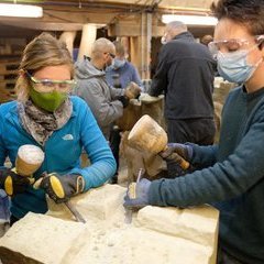 Am Samstag, den 26. September 2020 - pünktlich um 10 Uhr - mit Ausnahme derjenigen, die sich verfahren hatten, starteten 17 Assistenzärtze*innen sowie Mitarbeiter und Prof. Reinhard von der Augen Universitätsklinik Freiburg mit dem Teamtag am Maierhof in St. Wilhelm.Aufgabe war es, eine Skulptur aus einem großen Sandsteinblock zu schaffen. Der große Block war bereits von mir am Vortag in fünf kleinere Blöcke horizontal mittels Keiltechnik getrennt worden. Zum Verständnis des weiteren Vorgehens hatte ich den Block im Atelier wieder zusammengesetzt. Die Grundidee wurde aufgezeichnet und die Steine daraufhin auf fünf Gruppen à drei bis vier Personen verteilt.