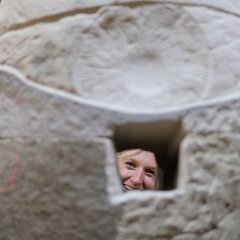 Die fünf Teams mussten die Steine derart bearbeiten, dass die durchgängigen Linien der Durchbrüche, der sogenannten Foci, mit den darunter bzw. darüberliegenden Steinen später übereinstimmten. Im unteren und oberen Block wurden zudem jeweils und von beiden Längsseiten ein Auge eingearbeitet. Das untere nach oben schauend, das obere nach unten schauend. Die Foci (von Fokus=singular/ foci= plural) auf verschiedenen Ebenen und überkreuz, also von allen vier Seiten, angelegt, sind natürlich auch eine Reminiszenz an diese Abteilung der Uniklinik. Spielerisch können hier, wie auch schon nach vollendeter Arbeit durch die angehenden Fachärzte getan, die Besucher der Augenklinik beim Betreten oder Verlassen der Uniklink Kontakt mit den Augen aufnehmen, besonders Kinder werden davon sicherlich häufiger Gebrauch machen:-)