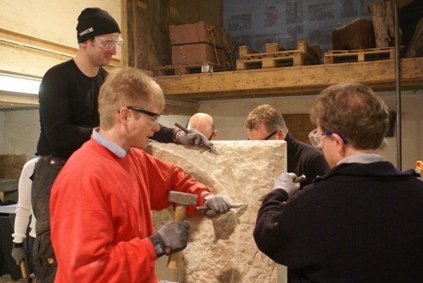 Nachdem die Gestaltung im Team besprochen und geplant war - eine dynamische Spirale, die sich um den zu erarbeitenden Durchbruch zu einer Seite aus dem Stein herausdreht, wurde im 8er Team der Stein von zwei Seiten zeitgleich bearbeitet.