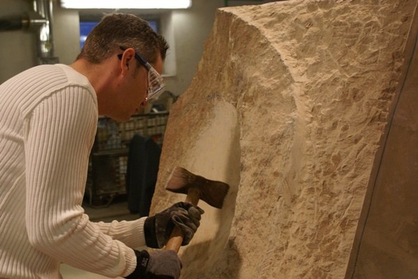 Um dieses kompakte und umfangreiche Thema auf die Beine zu stellen, bedurfte es eines Durchbruchs. Dieser sollte nun im Atelier in praktisch und nachvollziehbarer Art und Weise erreicht werden. Martin Wiese hatte einen großen Thüster Kalkstein besorgt, der sich aufgrund seiner partiellen geringen Dicke anbot, im Rahmen einer Gesamtgestaltung zu durchschlagen.